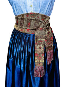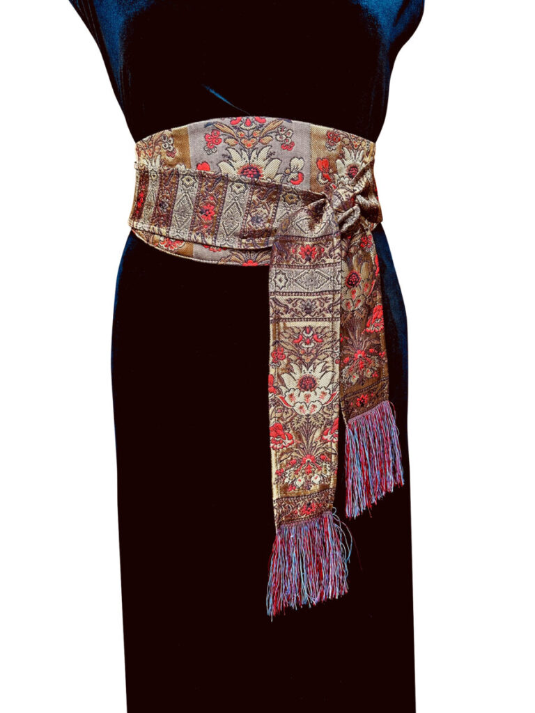 Pas ma długość 274 cm i 14 cm szerokości na przedzie. Pas przylega szeroką częścią z przodu, krzyżuje się na talii z tyłu i zawiązuje z boku.