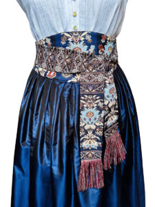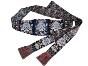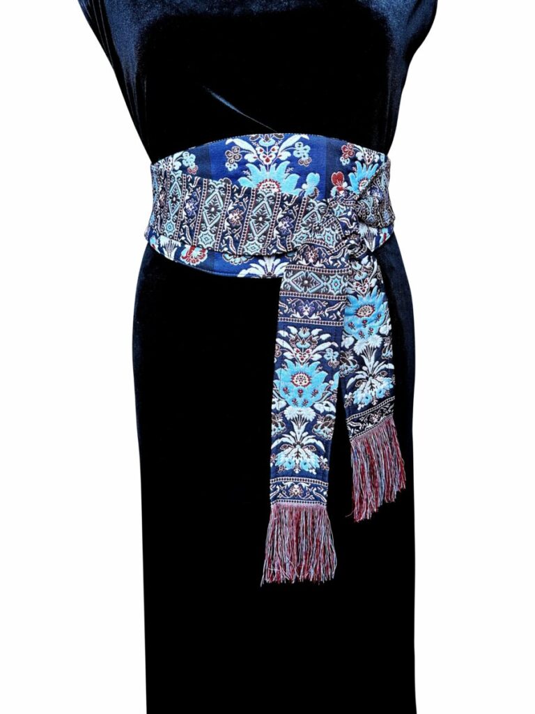Pas ma długość 274 cm i 14 cm szerokości na przedzie. Pas przylega szeroką częścią z przodu, krzyżuje się na talii z tyłu i zawiązuje z boku.
