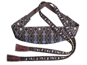 Pas o całkowitej długości 278 cm i szerokości 12,5 cm w części przedniej. Pas przylega szeroką częścią z przodu, krzyżuje się na talii z tyłu i zawiązuje z boku.
