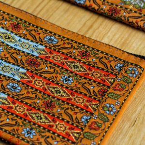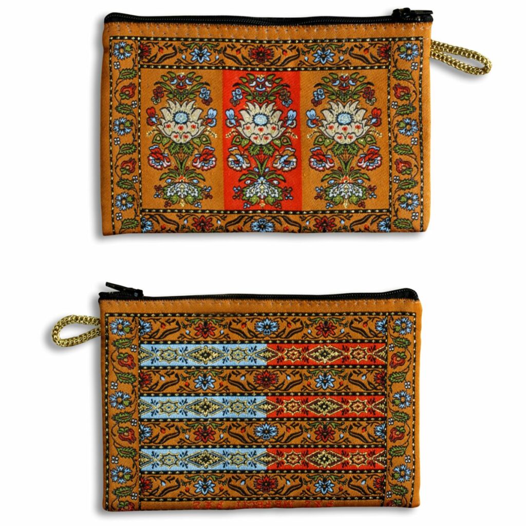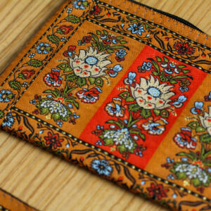 Pugilares posiada tkany, historyczny ornament powtarzający wzór spotykany w głowach pasów kontuszowych i ma rozmiar 10 cm na 14cm (zamyka się na zamek błyskawiczny).