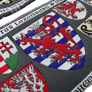 • W centrum: Herb Księstwa Luksemburga: na polu srebrnym w pasach niebieskich koronowany lew czerwony