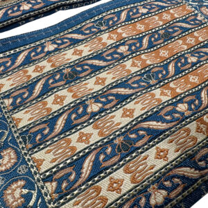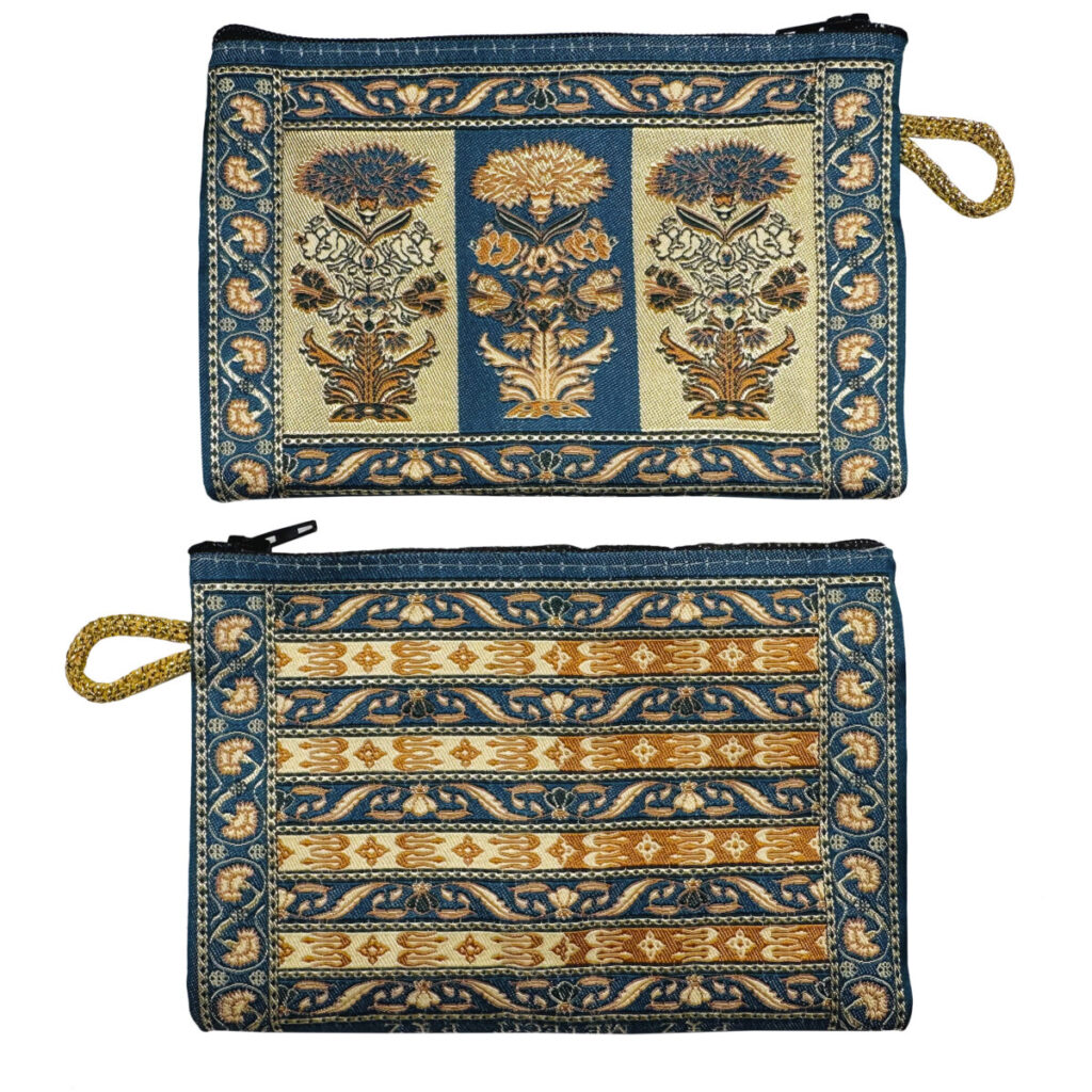 Pugilares posiada tkany, historyczny ornament powtarzający wzór spotykany w głowach pasów kontuszowych i ma rozmiar 10 cm na 14cm (zamyka się na zamek błyskawiczny).