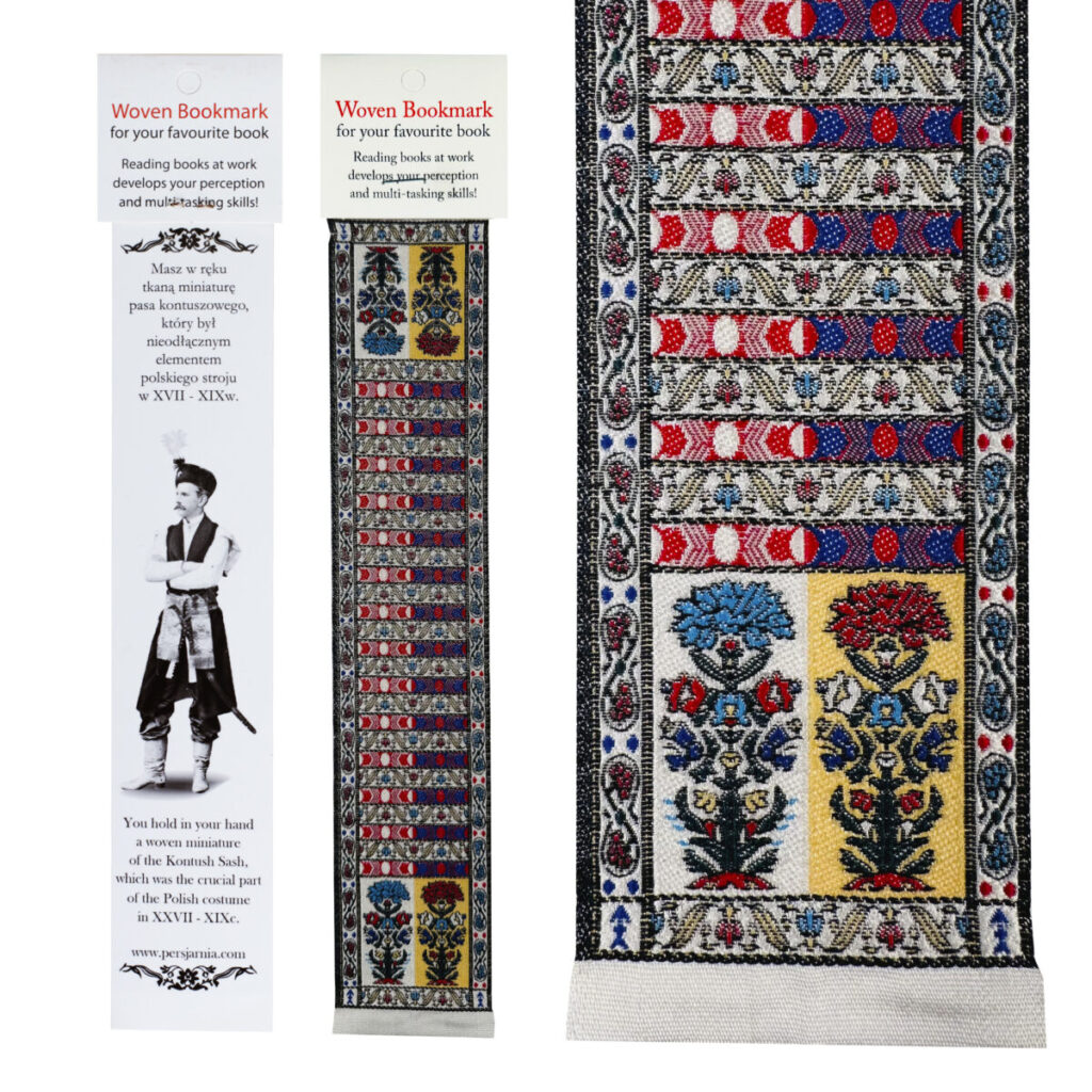 Zakładka do książki to tkanina jednostronna w formie miniatury pasa kontuszowego,o rozmiarze 5cm na 25cm, zapakowana w przezroczystą elastyczną obwolutę. Cena detaliczna: 12 zł.