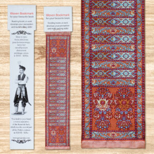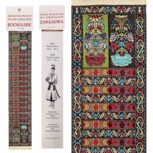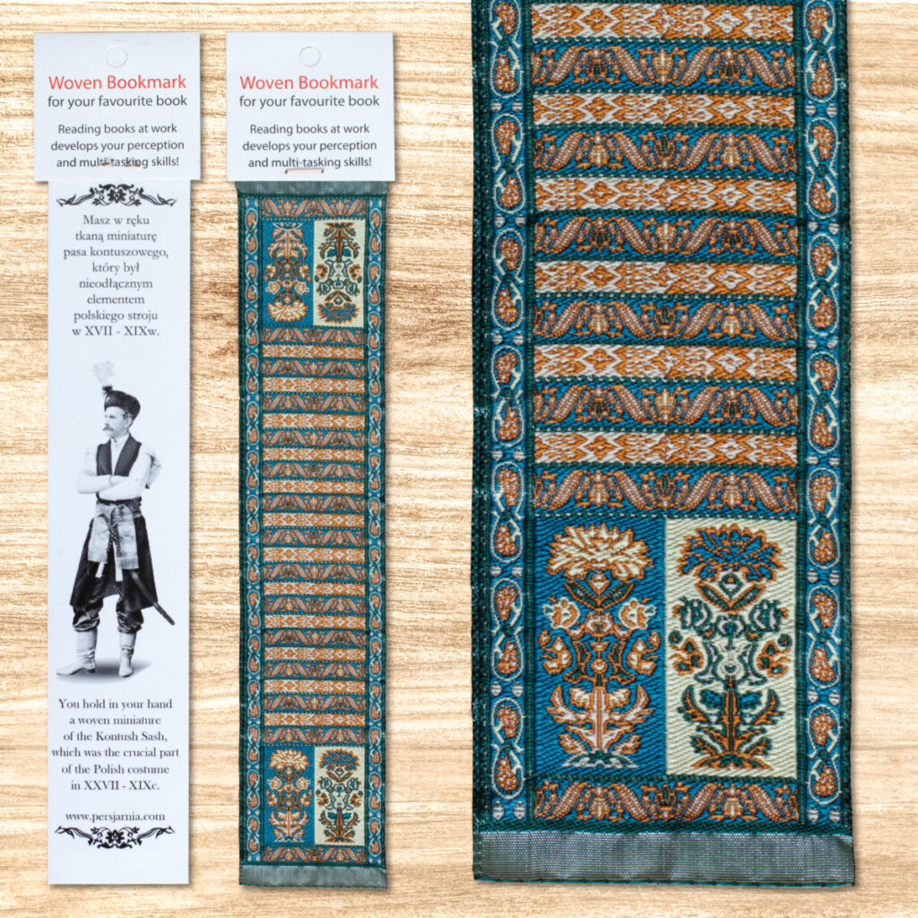 Zakładka do książki to tkanina jednostronna w formie miniatury pasa kontuszowego,o rozmiarze 5cm na 25cm, zapakowana w przezroczystą elastyczną obwolutę.