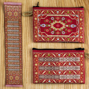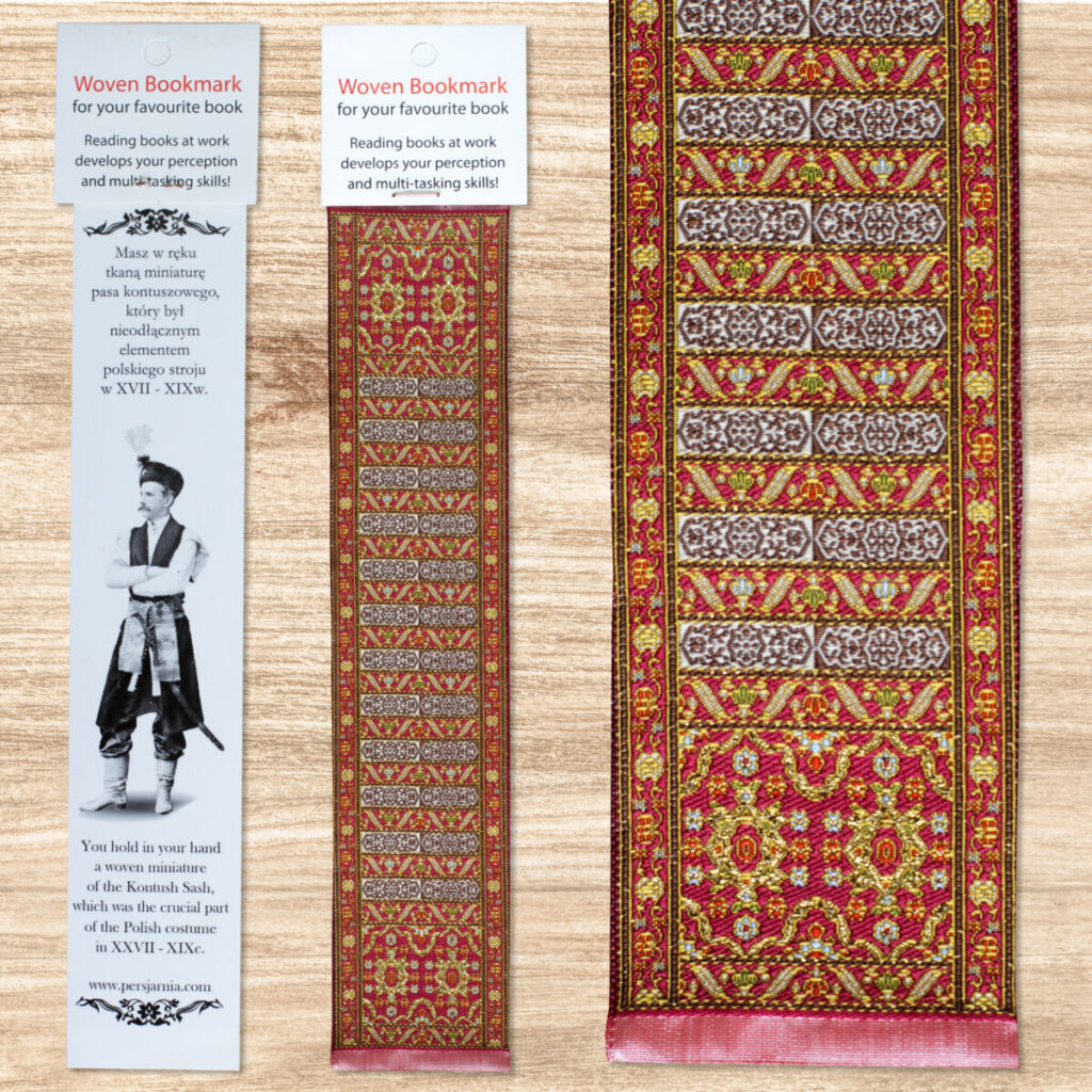 Zakładka do książki to tkanina jednostronna w formie miniatury pasa kontuszowego,o rozmiarze 5cm na 25cm, zapakowana w przezroczystą elastyczną obwolutę.