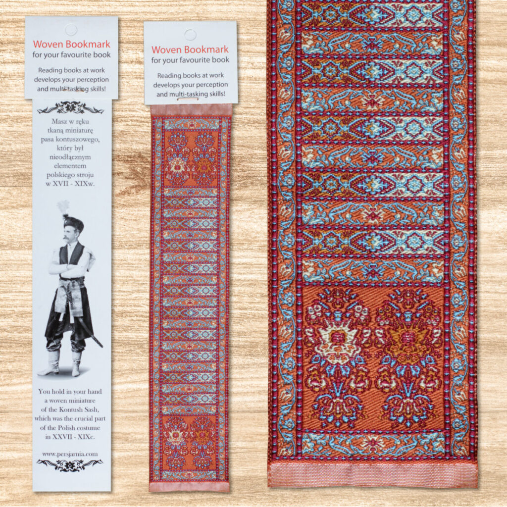 Zakładka do książki to tkanina jednostronna w formie miniatury pasa kontuszowego,o rozmiarze 4,5cm na 24cm, zapakowana w przezroczystą elastyczną obwolutę.