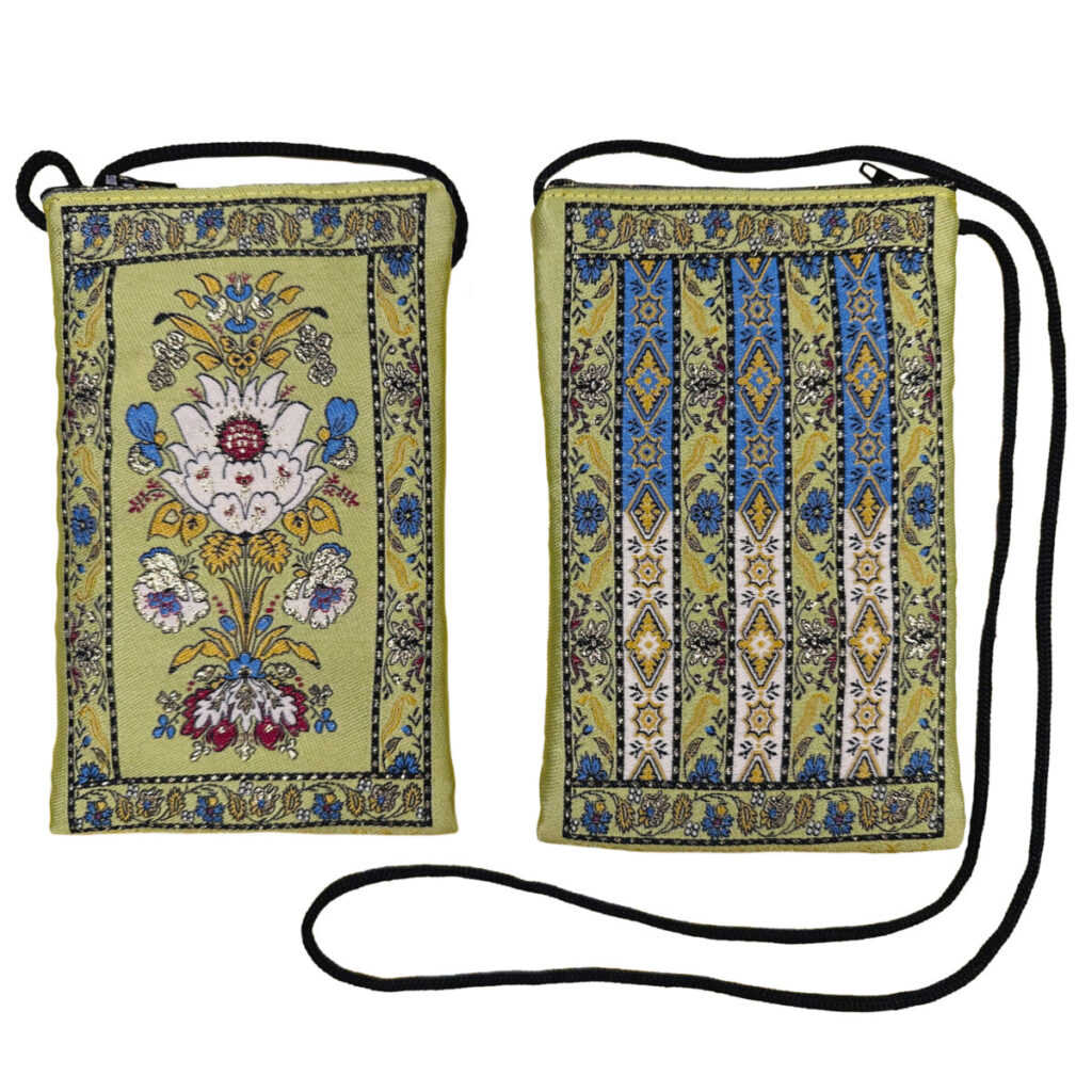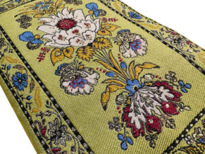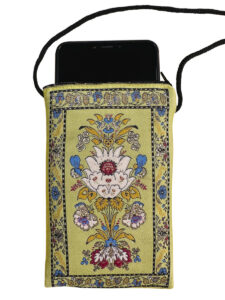 Futerał posiada tkany, historyczny ornament, powtarzający wzór spotykany w głowach pasów kontuszowych i ma rozmiar 10 cm na 17cm (zamyka się na zamek błyskawiczny).