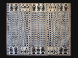 Jest rok 1520. W porwanej z Polski młodziutkiej Aleksandrze Lisowskiej zakochuje się na umór potężny monarcha – Sulejman Wspaniały. Śliczna dziewczyna otrzymuje jako prezent zaręczynowy olbrzymi, szafir o wadze sześciuset karatów. Rudowłosa niebieskooka piękność nie rozstaje się z oprawnym w złoto kamieniem o kolorze nieba w bezwietrzne południe. Nasza tkanina to ukłon w stronę kolorów które przynosiły szczęście wielkiej Królowej. Prócz granatu i złota jest tam kolor jej włosów i błękit jej oczu.