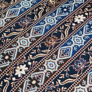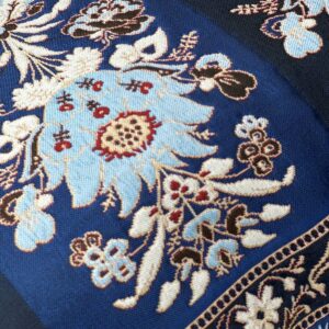 Nasza tkanina to ukłon w stronę kolorów które przynosiły szczęście wielkiej Królowej. Prócz granatu i złota jest tam kolor jej włosów i błękit jej oczu.