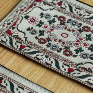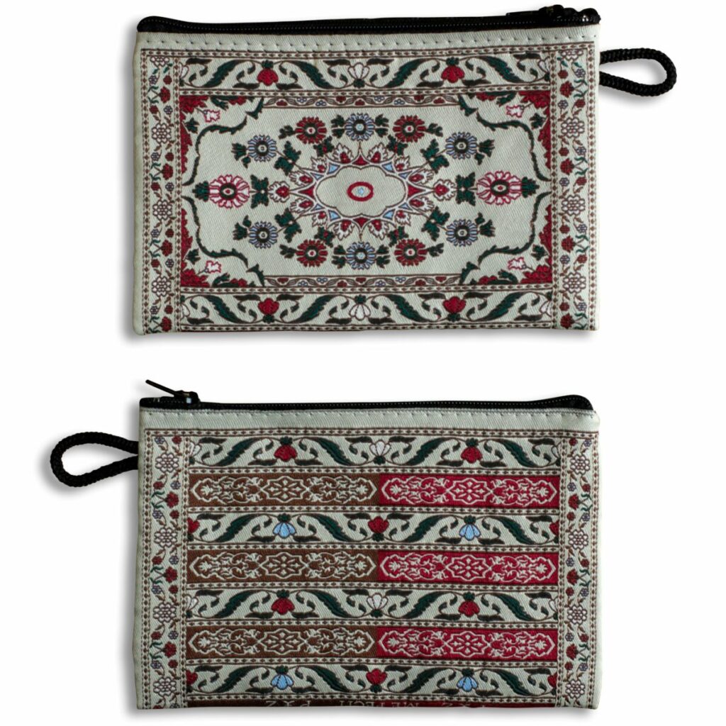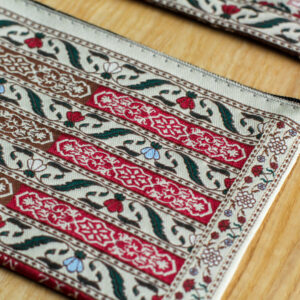 Pugilares posiada tkany, historyczny ornament powtarzający wzór spotykany w głowach pasów kontuszowych i ma rozmiar 10 cm na 14cm (zamyka się na zamek błyskawiczny).