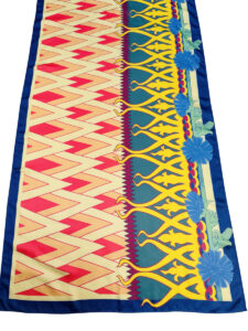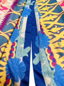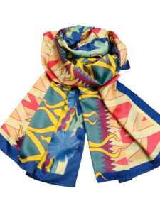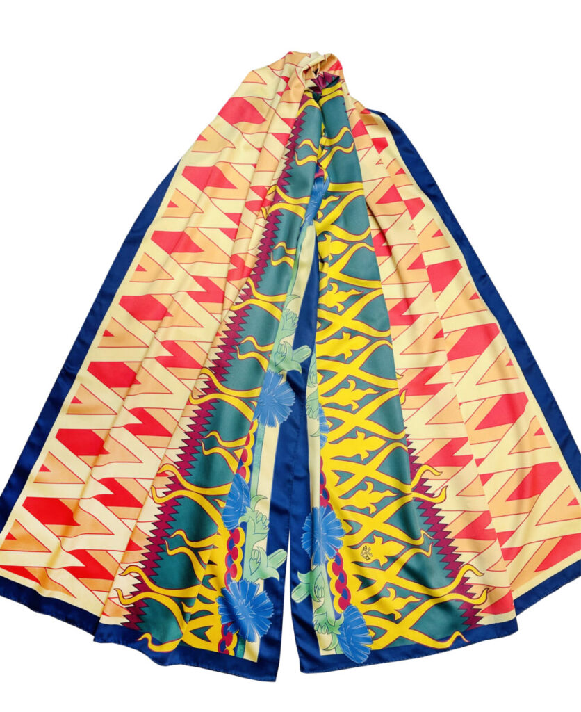 Materiał: „sztuczny jedwab” 100% PES (ani jeden jedwabnik nie zginął przy produkcji tych szali), który w dotyku doskonale “udaje” naturalny jedwab.
