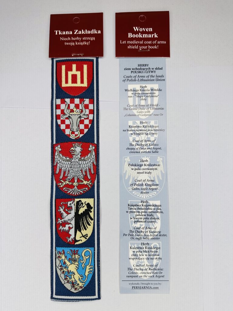 Zakładka z herbem Królestwa Polskiego i herbami ziem wchodzących w skład unii polsko-litewskiej z przełomu XIV i XV w.- z okresu Bitwy pod Grunwaldem.